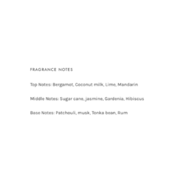 Escape to paradise with this sun-soaked, tropical fragrance that captures the essence of carefree luxury. It opens with a sparkling blend of bergamot, lime, and mandarin, beautifully softened by creamy coconut milk for an irresistibly fresh start. The heart blossoms with exotic scents of jasmine, gardenia, and hibiscus, accompanied by the sweetness of sugarcane, evoking the warmth of an island breeze. As it lingers, sensual notes of patchouli, musk, tonka bean, and a touch of rum create a smooth, addictive finish. Radiant, warm, and effortlessly captivating, a scent that feels like endless summer.