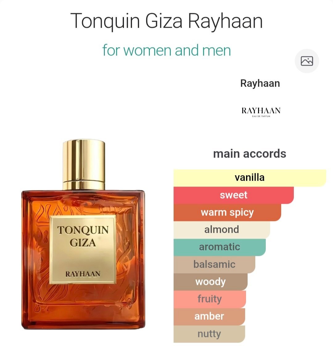 Tonquin Giza by Rayhaan is a Oriental Vanilla fragrance for women and men. This is a new fragrance. Tonquin Giza was launched in 2026. Top notes are Spices and Cacao; middle notes are Coumarin and Bitter Almond; base notes are Tonka and Vanilla.